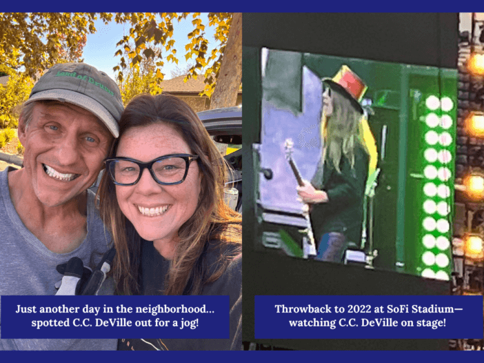Our neighbor, C.C. DeVille, is a rock legend and was part of the famous 1980’s and 1990’s rock band, Poison. It’s not everyday that you can be walking your dogs in the neighborhood and see a rock legend and guitar virtuoso running down the street with 5lbs weights, scraggly hair, an old sweatsuit, and the biggest smile you ever did see.